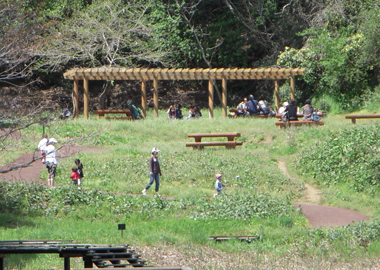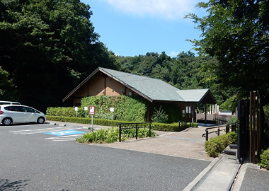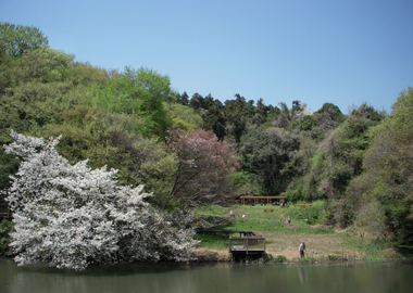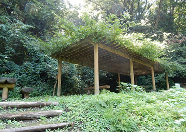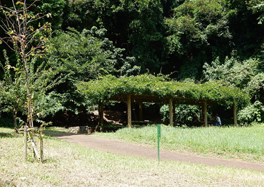 広場と池を谷戸の奥から眺められます。藤棚の下のテーブルとベンチでほっと一休み。