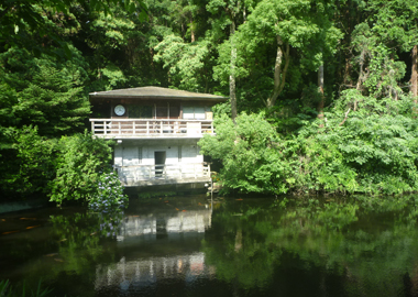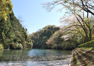 池のほとりでは、春にはサクラ、秋には紅葉、冬には野鳥の飛来が楽しめます。